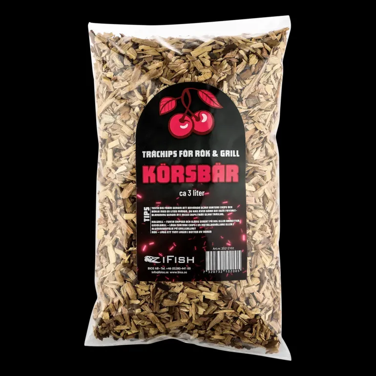 Rökflis för rökugnen och grillen, påsen innehåller ca 3 liter och har en doftande körsbärsessens.