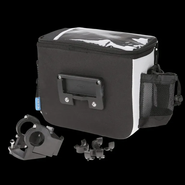 Bag för montering på cykelstyre, komplett med vindklaffar, regnskydd, axelrem och vadderad insida som skyddar dina saker. Flera förvaringsfack.
