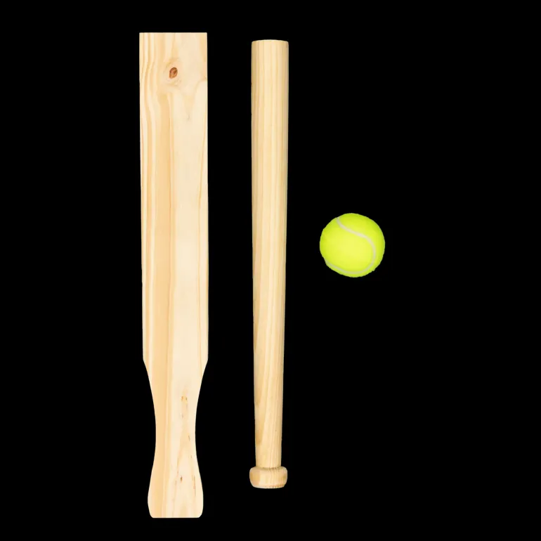 Brännbollsset med två slagträ, ett platt och ett runt med mått 50 cm och 50 cm. Levereras med tennisboll. Rekommenderas från 6 år.