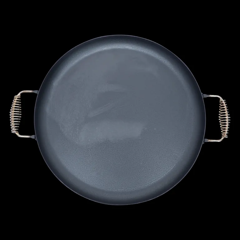 Hällmark Frying Pan 51 cm är en traktörhäll med upphöjda kanter av högkvalitativt varmvalsat stål. Handtagen är tillverkade av kromat fjäderstål.