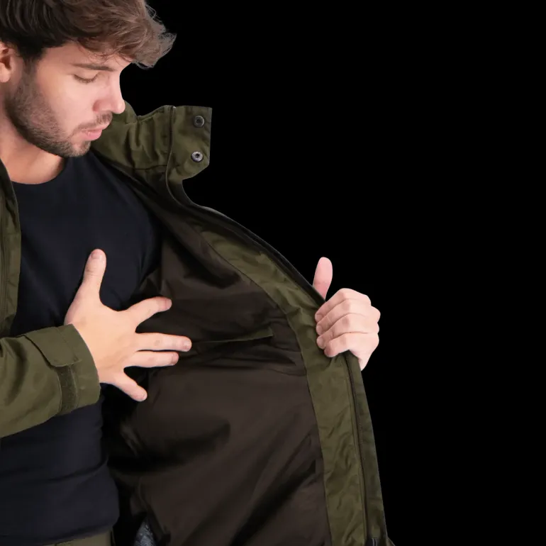 Slitstark allround jaktjacka i vind- och vattentätt vaxat material. Elastiska paneler för ökad rörelsefrihet.