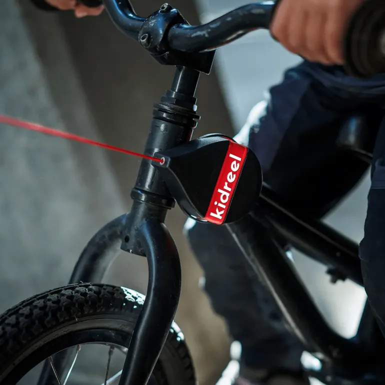 Med Kidreel Blue kan föräldrar bogsera sitt barn. Det är en rulle som enkelt monteras på barncykeln och automatiskt spolas tillbaka så att du kan bogsera dem vid behov. Produkten passar från det att barnet lärt sig att cykla, till den dag de kör om mamma och pappa i nedförsbacken.