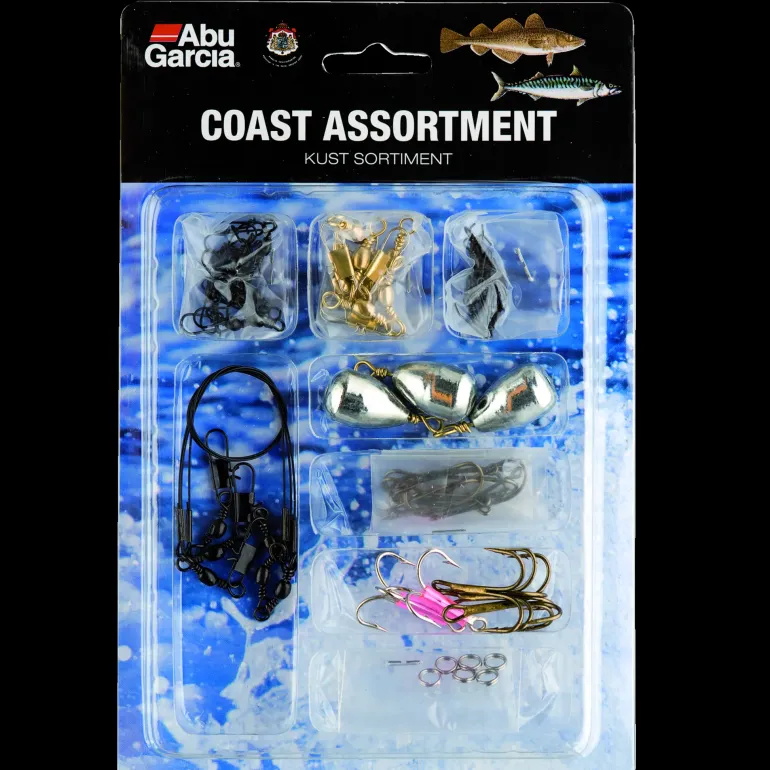 Praktiskt tillbehörssortiment för kustfiske. Tafsar, beteslås,större enkelkrok, trekrok och bomssänken.