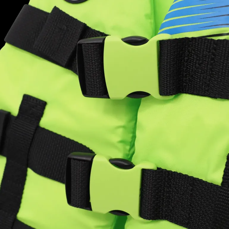 Flytvästen kommer med synliga färger som ser till att barnet alltid syns i vattnet. Tre YKK-spännen och justerbara remmar säkerställer en bra och bekväm passform.