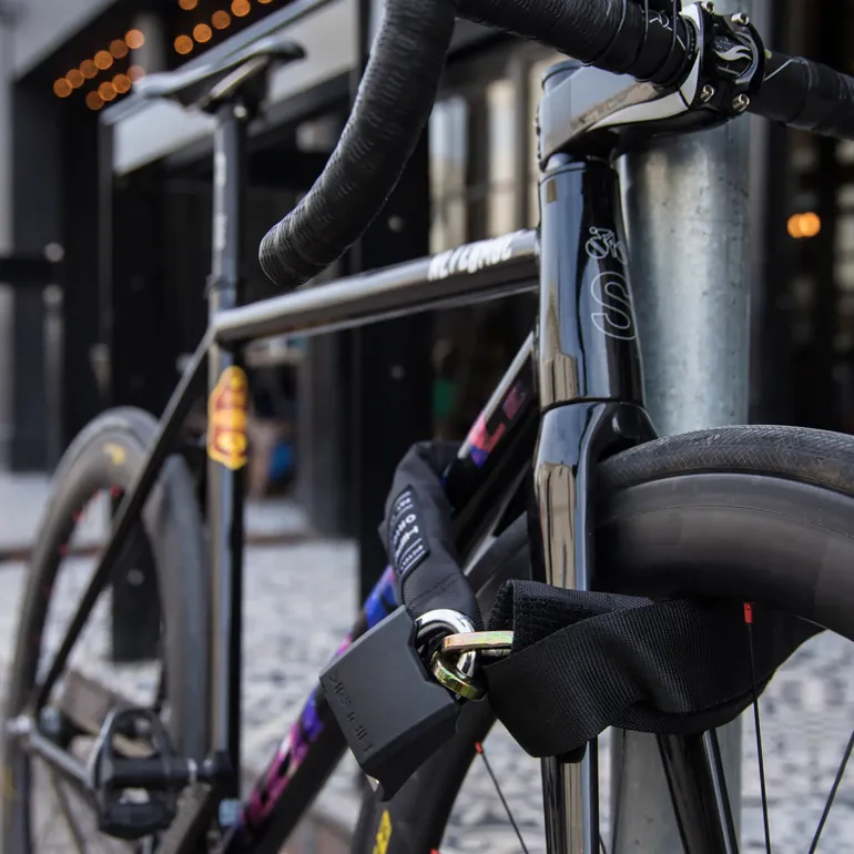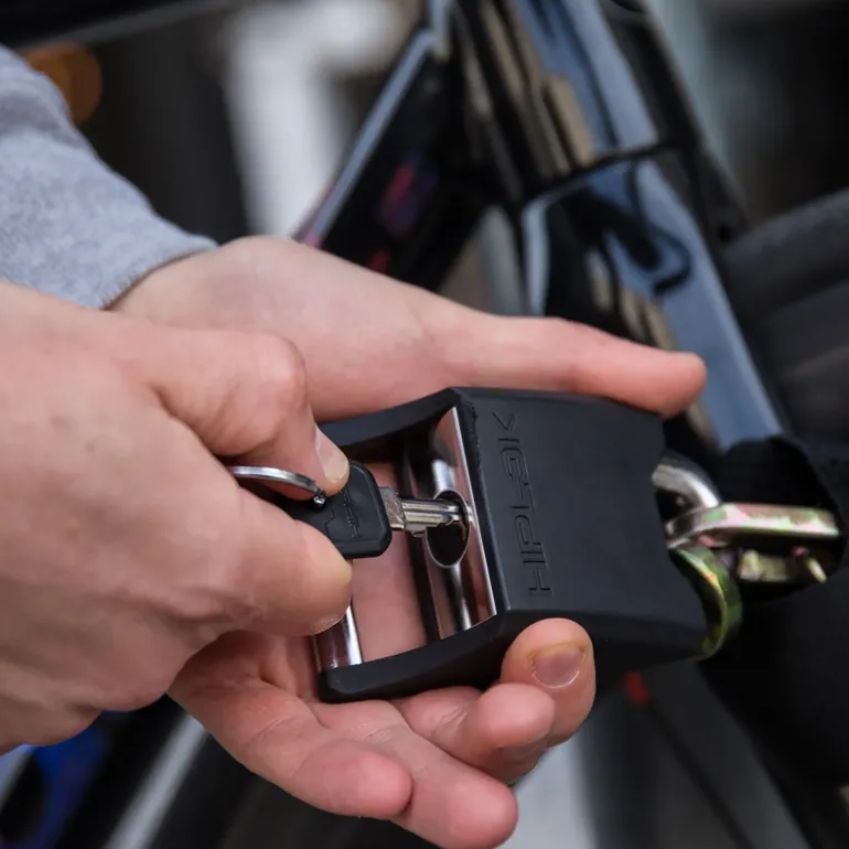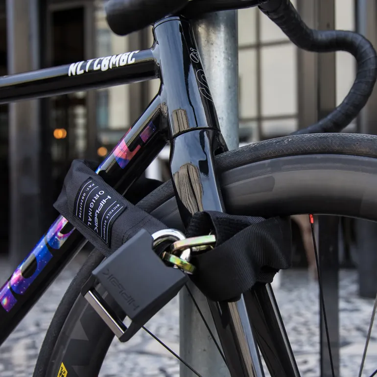 Slitstarkt nylonöverdrag som kan tas av och tvättas om det blir smutsigt. Hiplok Original passar för dyra cyklar som parkeras i områden med hög stöldrisk. Levereras med hänglås i 10 mm tjockt härdat stål.