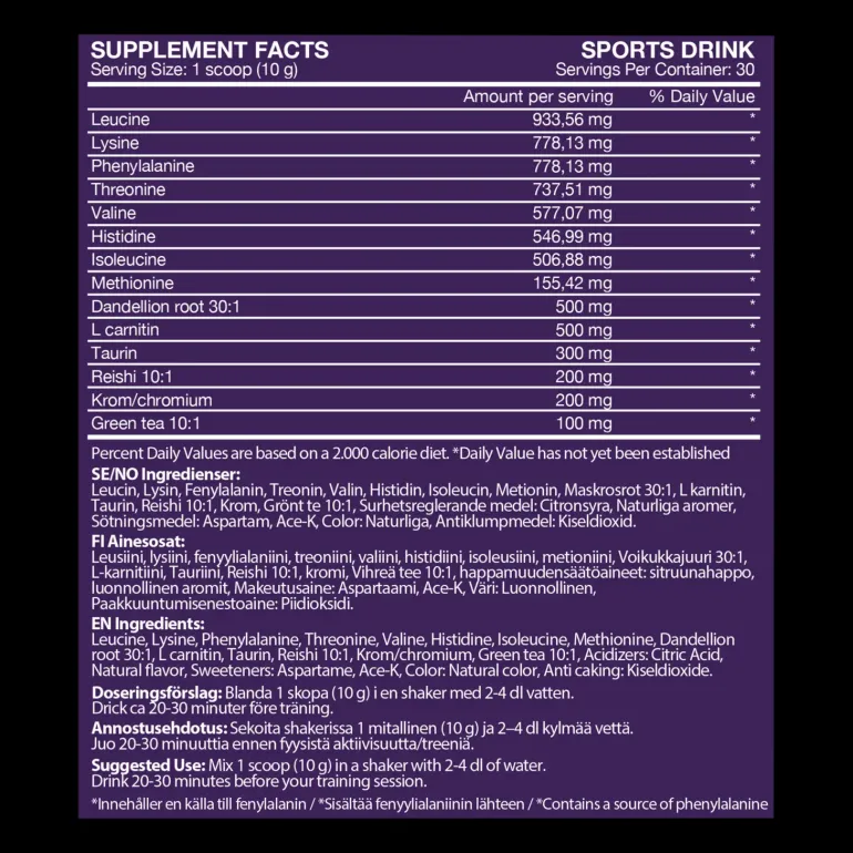 Essentiella aminosyror i kombination med fettförbrännande och vätskedrivande ingredienser. Kommer med godissmaken purple punch. 30 serveringar per förpackning.