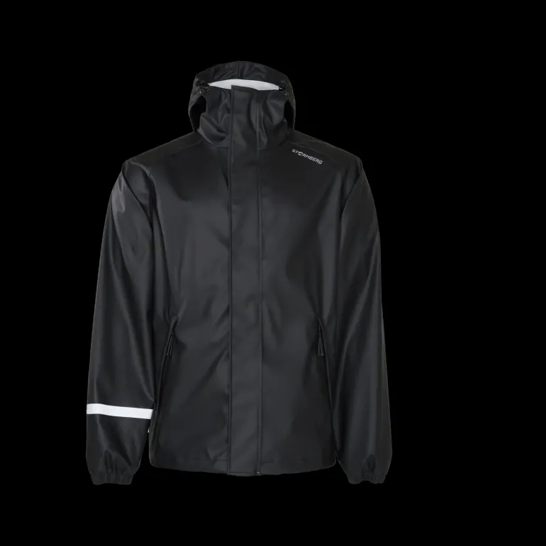 Lätt och bekväm regnjacka i vatten- och vindtätt material (vattenpelare: 10 000 mm). Justerbar huva, elastiska manschetter. Reflexband runt ena armen.