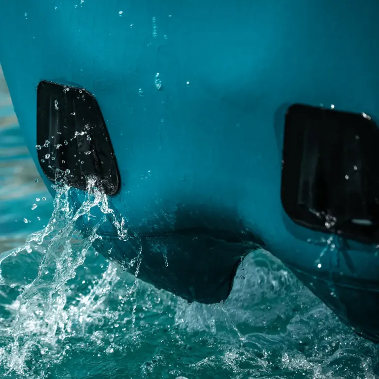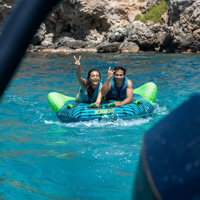 Scout Towable från Jobe är även utrustad med Drain Tech-system. Detta innebär att tuben är designad på ett aerodynamiskt sätt som gör att den är lättare att släpa efter båten, vilket gör att båten sparar bränsle.