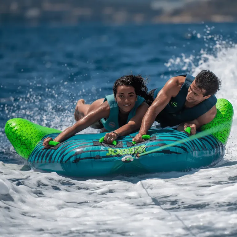 Tube för två personer med avsmalnande form för enkel ingång. Specialdesignad form så att den glider lätt över stora vågor. Sittdynan i neopren ger bättre grepp.