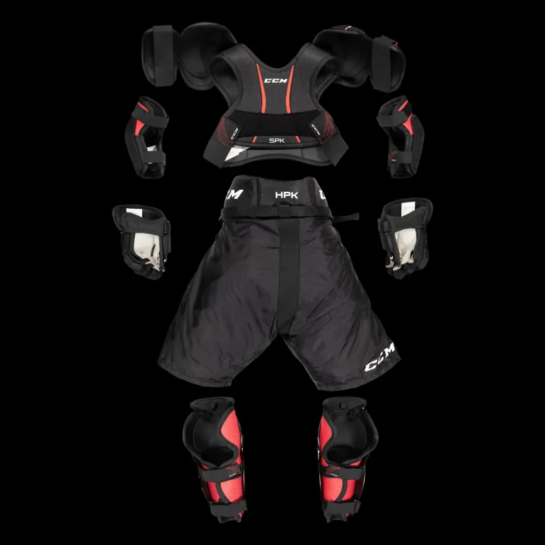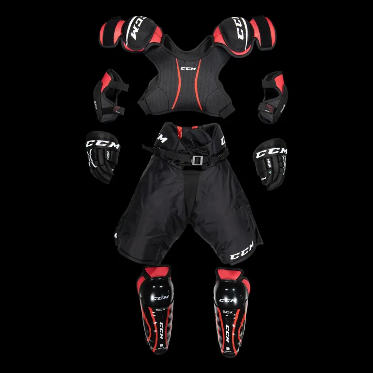 Set för den unga hockeyspelaren. Innehåller skulderskydd, armbågsskydd, benskydd, handskar och byxor. Perfekt för nybörjaren.